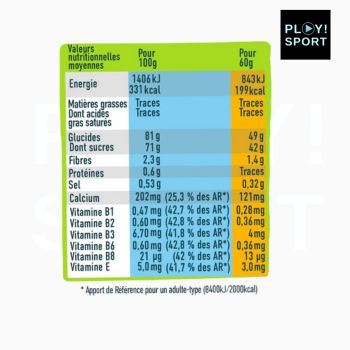 Ingrédients : purées de fruits 54% (purée d'abricots 36%, purée de bananes 18%), sirop de glucose, sucre, gélifiant: pectines, acidifiant: acide citrique, citrate tricalcique, chlorure de potassium, arôme naturel d'abricot, agent d'enrobage: cire de carnauba, huile de tournesol, vitamines: B1, B2, B3, B6, B8, E. Amidon de blé.